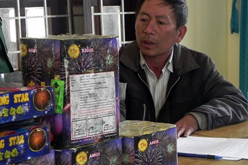 Nguyễn Quang Thỉu và số pháo lậu tang vật. Ảnh: Quang Hà.