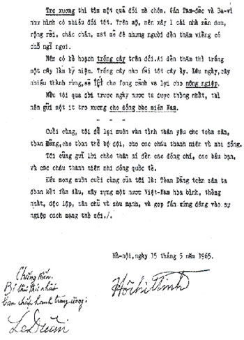 Bản di chúc viết năm 1965 do Bác tự đánh máy và có sự chứng kiến của Bí thư thứ nhất ban chấp hành trung ương Đảng Lê Duẩn.